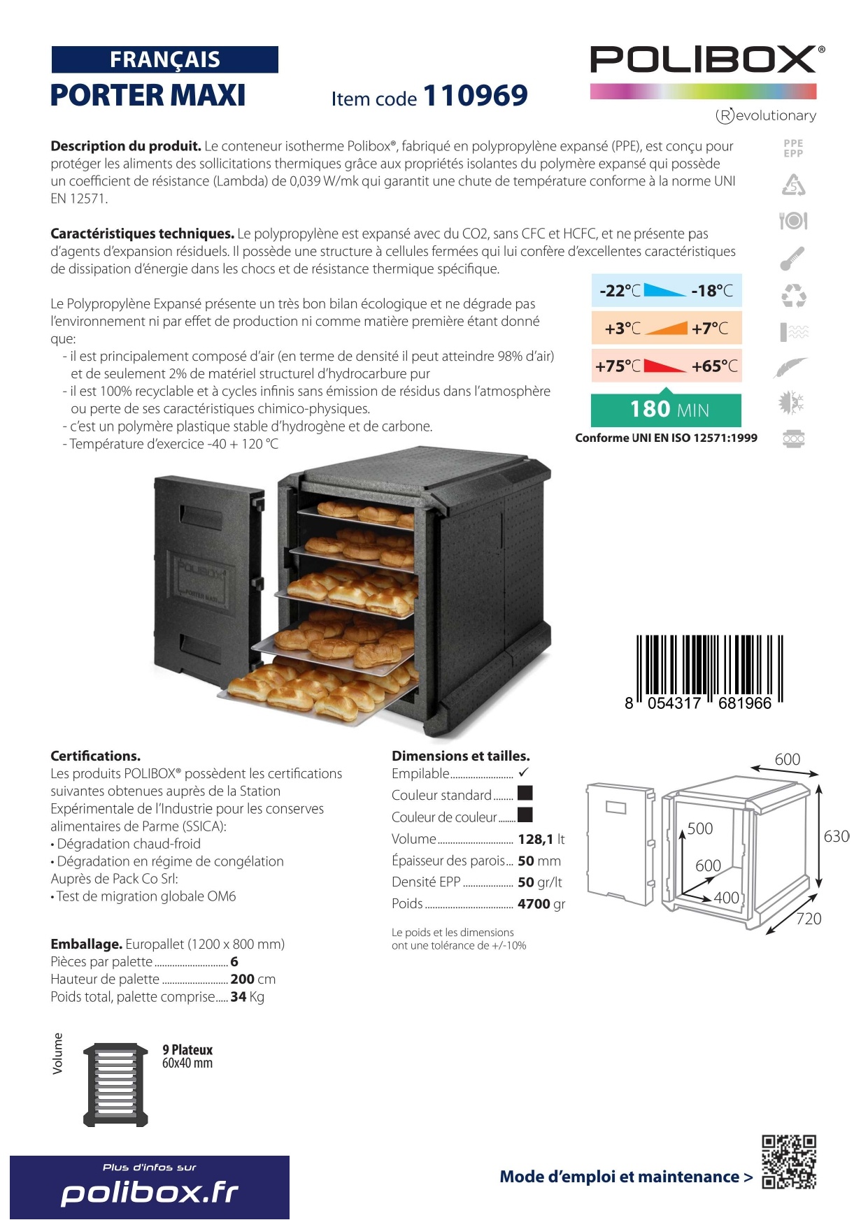 Très performant, le PORTER MAXI 600 x 400 mm garantit une chute thermique comprise entre 1,5 et 2,5 °C par heure. Sans plaques eutectiques.